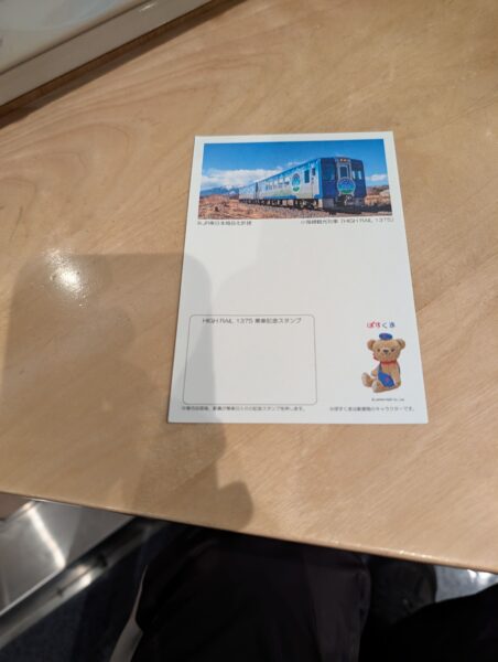 車内物販カウンターでオリジナルはがきをいただき、宛名とメッセージを書き込む。