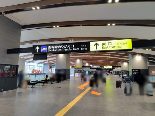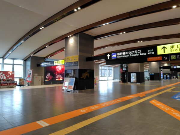 西口から新幹線や特急のホームがある新駅舎までは離れているので、時間に余裕を持って戻ってきましょう。エレベーター→動く歩道→エレベーターで戻ってきます。ちなみに、新駅舎の高さ37mも日本一だそうです。