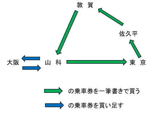 これは、JRの運賃は基本、距離が長くなればなるほど1キロあたりの料金が割安になる法則を使い、佐久平発→山科経由→佐久平着の一筆書きの乗車券と山科⇔大阪の乗車券を組み合わせるというもの。