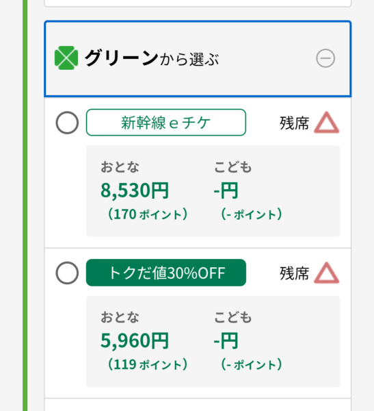 普通車の30%OFFは売り切れだけど、10%OFFとグリーン車の30%OFFは残っていますね。