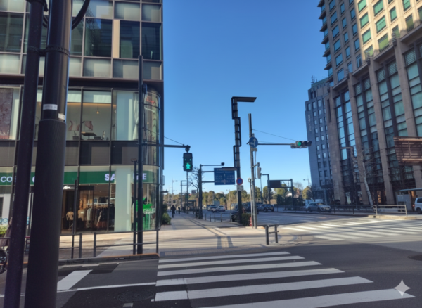 渡ったら右(西側・皇居側)へ。このまま日比谷通りへ出て左折してもいいのですが、アルクママ的には1つ手前の信号を左折して日比谷仲通りを通るのがおすすめ。