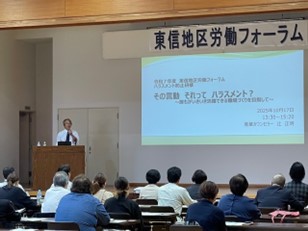 当所が開設している労働相談でもハラスメントに関する相談が数多く寄せられている状況です。そこで今年の東信地区労働フォーラムは、10月17日に長野県佐久合同庁舎で一般社団法人日本産業カウンセラー協会 産業カウンセラー 辻正明先生を講師にお招きしてパワハラを含むハラスメントをテーマに「その言動 それって ハラスメント?~誰もがいきいき活躍できる職場づくりを目指して~」と題して開催いたしました。