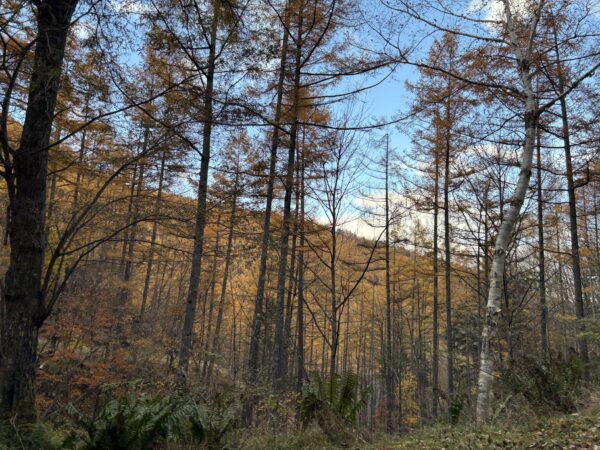 「春になると新緑が綺麗だな」「針葉樹で落葉してる木があるような?」「秋になると山が黄金色になるな」等々…