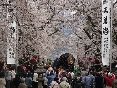 【満開の桜の参道を進む羽広の獅子舞】