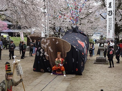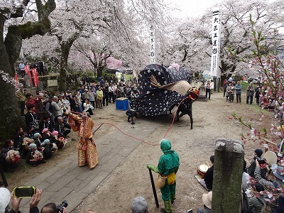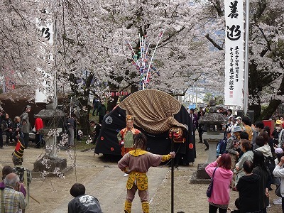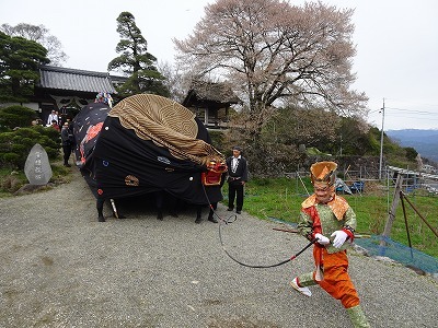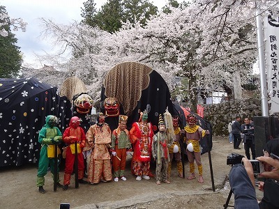 【地主桜を背景に舞う瑠璃寺の獅子舞】