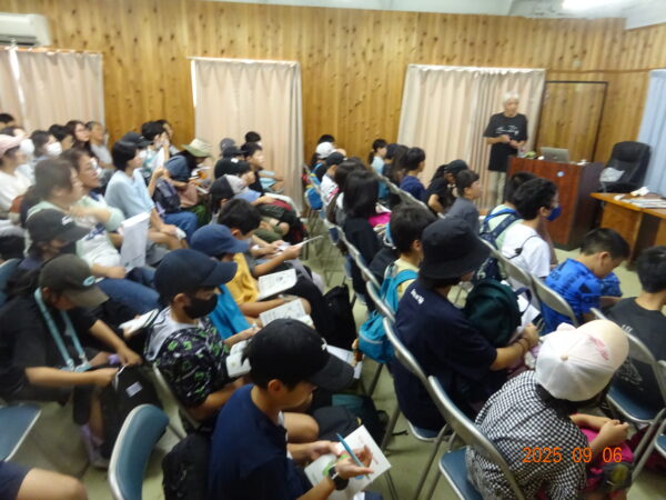 晴れやかな空の元でウミガメの保護活動を行っているNPO法人サンクチュアリネイチャーセンターの講義を受けて学び、プラスチックスマートについて考えていただきました。