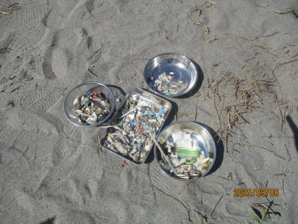 マイクロプラスチック回収及びゴミ拾い体験では、一見キレイに見える遠州灘海岸でもいろいろなゴミや細かくなったプラスチックが漂着していることを体験していただきました。
