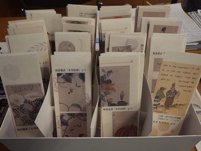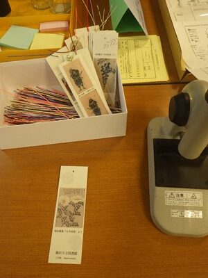2階の受付では、「久堅(ひさかた)和紙」のしおりを頂き、自分で穴をあけて水引を通してオリジナルしおりを作成できました![]()