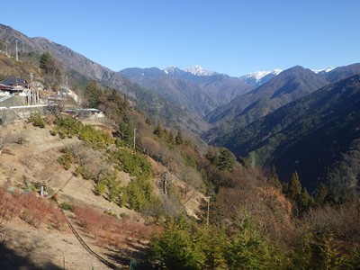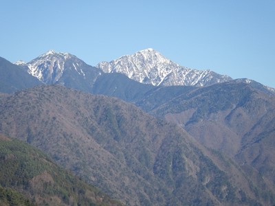 食事の後、立会いの現場(飯田市下栗)へ行くと雪化粧した聖岳が聳えていました![]()