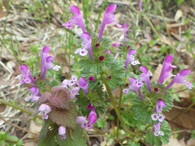 現場にはホトケノザ(仏の座)【シソ科】が可愛らしい花を咲かせていました。名前の由来は、葉の形が仏様の台座である蓮華座のように見えることからです。