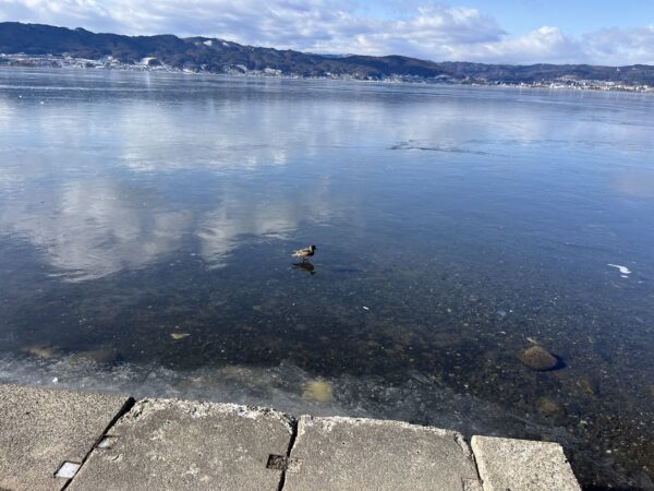 同じ下諏訪町内でも、このあたりは気温の上昇により溶けてしまっていました。諏訪市では氷の上を歩いていた鳥は、こちらでは泳いでいました。