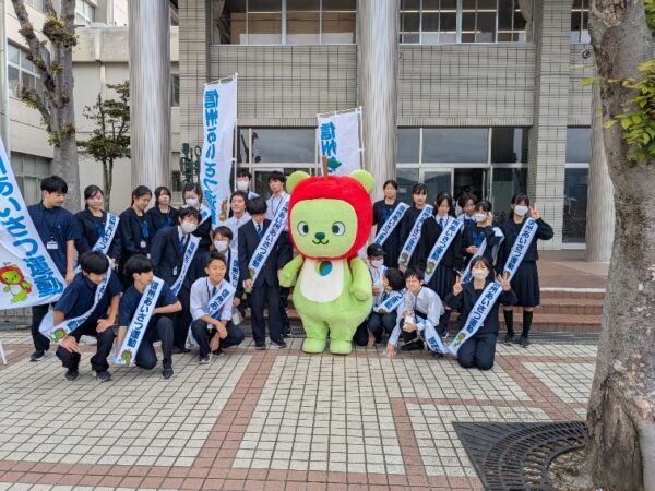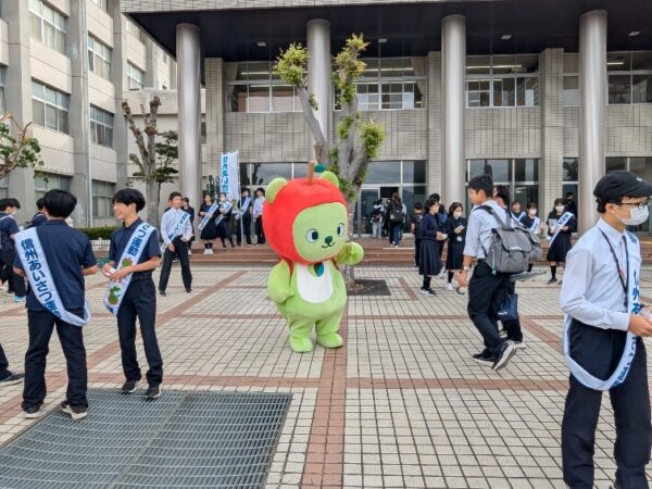長野県からはスペシャルゲストのアルクマも加わり、総勢約30名が登校する生徒たちに「信州あいさつ運動」のポケットティッシュとリーフレットを手渡し「おはようございます」と2回目でもあり前回よりも大きな声で元気よくあいさつを交わしました。