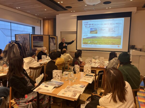 はじめに諏訪地域の歴史に詳しくまちあるきガイドも務めるスワニミズム坂間さんから「なぜ諏訪地域に温泉がたくさん湧いているのか」、歴史と地質からわかりやすくお話いただきました。歴史・地質と聞くとなんだか難しいお話のように思いますが、諏訪地域のことをあまり知らない方、歴史が苦手な方でもわかりやすい内容で、みなさん興味深く聞いていました。