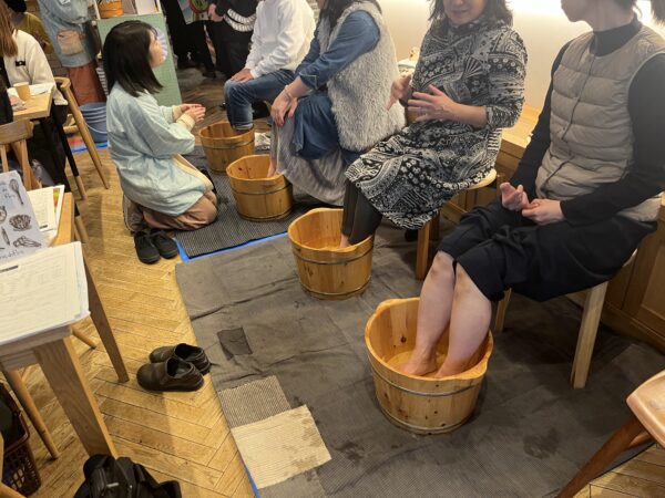 いよいよ朝汲んできた温泉の出番です。”ある企画”とは、銀座で諏訪の温泉を味わってもらおう!というもの。銀座NAGANOでは初の試みでした。素敵な木桶に温泉を用意し、足湯を体験していただきました。みなさんには素ほっこり時間を味わっていただけたようです。